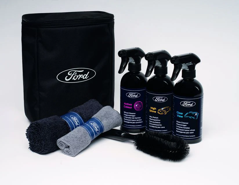 Con il “High shine” lucidante per cera, il “Clear view” detergente per vetri e il “Active colour” detergente attivo per ruote, questo kit completo di pulizia per gli esterni del veicolo è dedicato a ogni superficie esterna, lasciando i veicoli scintillanti con una finitura degna di un’esposizione in salone. Confezionato in una sofisticata borsa nera con marchio Ford e corredata di un panno in microfibra grigio, un panno in microfibra nero e una spazzola speciale per la pulizia delle ruote, questa soluzione è per una cura dell’auto di qualità.